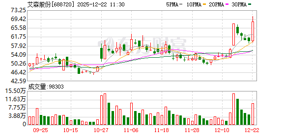 艾森股份股价创出历史新高,截至11:14,该股上涨17.08%多多策略,股价报70.06元,成交量884.96万股,成交金额5.70亿元,换手率15.70%,该股最新A股总市值达61.75亿元,该股A股流通市值39.50亿元。